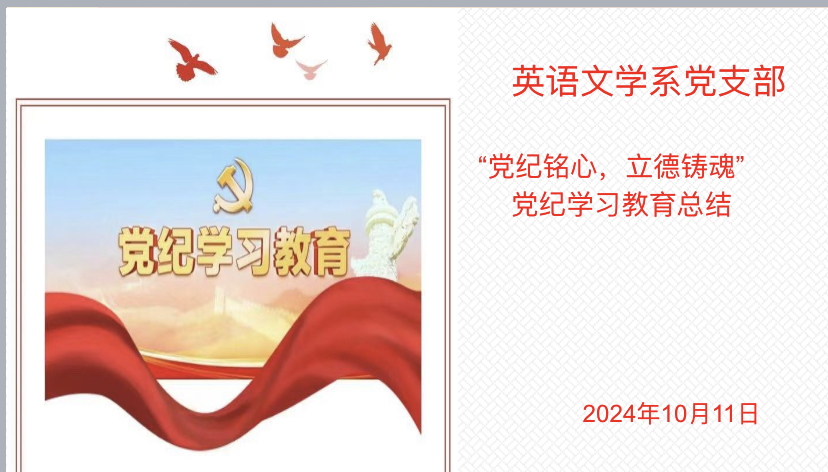 写作党支部、国别与跨文化系党支部及大学英语党支部也分别于10月9日下午在各自教研室进行本支部党纪学习教育总结。支部书记就本支部开展党纪学习教育的情况向支部全体党员进行了汇报。自党纪学习教育开展以来,各支部均将党纪学习教育作为今年党建工作的一项重要任务,高度重视,精心组织,支部书记认真履行“一岗双责”,党员教师积极参与学院举办的“四个一特色活动”,通过多种形式深入学习《中国共产党纪律处分条例》等党纪党规,准确掌握其主旨要义和规定要求。